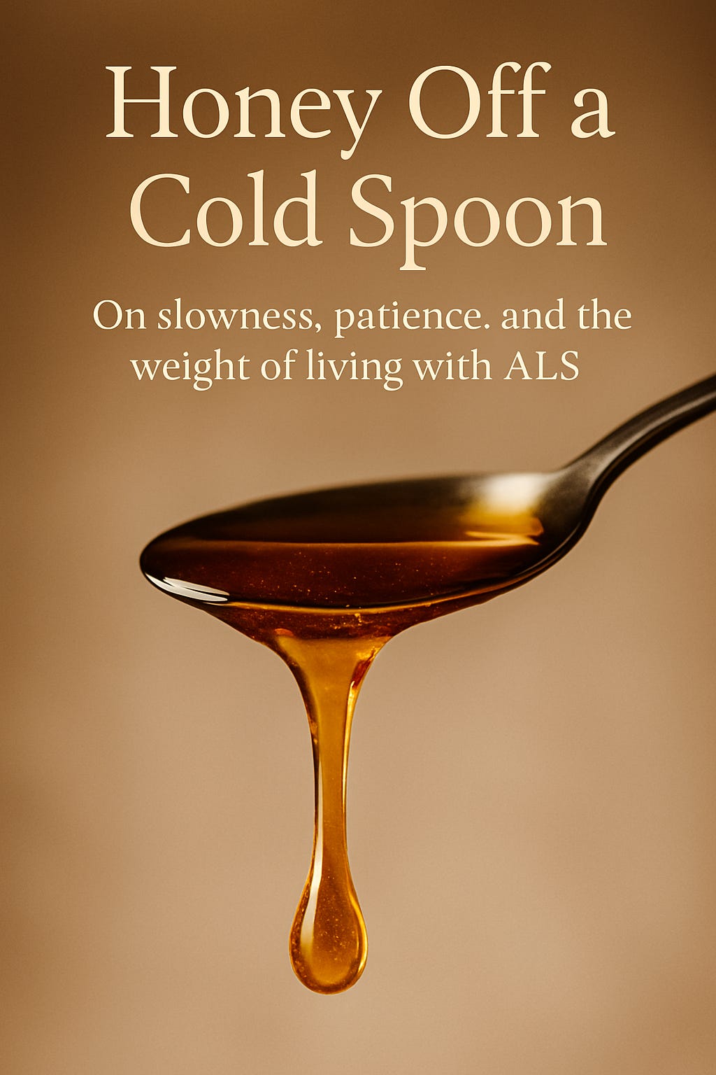 Honey Off a Cold SpoonOn slowness, patience, and the weight of living with ALSPippa CooperOct 05, 2025∙ Paid11ShareHoney off a cold spoon may be slow, but it is the truest measure of living.🎧 Prefer to listen? Here’s this post in my own voice.Continue reading this post for free, courtesy of Pippa Cooper.Claim my free postOr purchase a paid subscription.PreviousNext